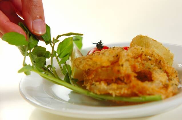 器に盛り、クレソン、プチトマト、レモンを添え、ケチャップやウスターソースなどお好みのソースをつけていただく。