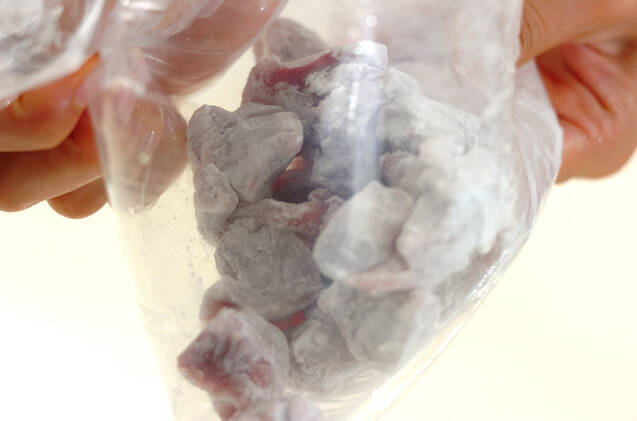 砂肝の汁気を軽く押さえ、少し多めに塩コショウをして片栗粉をまぶす。