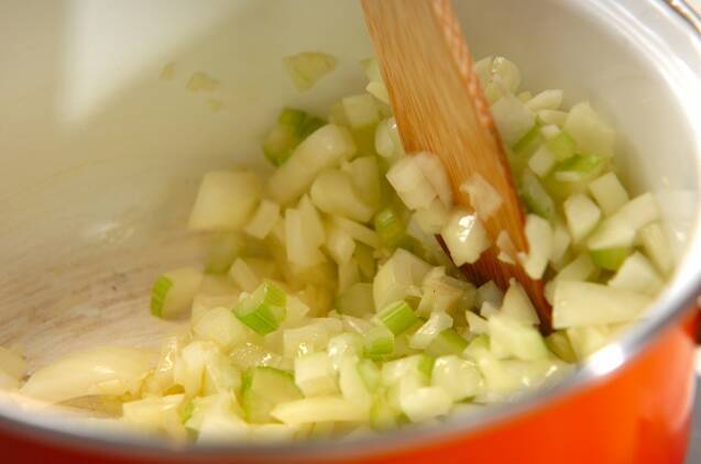厚手の鍋にオリーブ油、玉ネギ、セロリ、ニンニクを入れて中火にかけ、玉ネギが透き通るまで炒める。