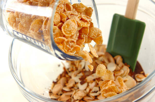 チョコレートはザックリ刻んで耐熱ボウルに入れ、湯煎にかけて溶かし、スライスアーモンド、コーンフレークを加える。