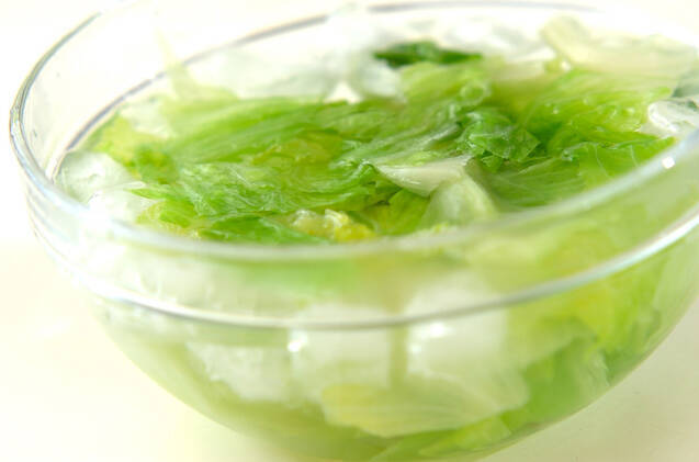 沸騰した湯でレタスをサッとゆでて冷水に取り、粗熱が取れたら水気を絞る。