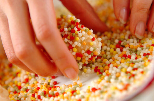 手に分量外のサラダ油を少しつけ、<肉団子>を1/16~1/20量取り、手のひらで丸く形付け、ぶぶあられを全体にまぶす。