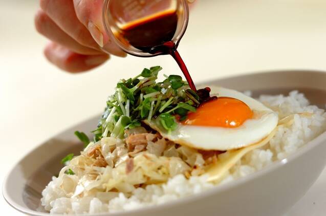 丼にご飯を盛り、スライスチーズ、(2)のツナキャベツ、目玉焼き、貝われ菜の順にのせる。最後にしょうゆをたらす。