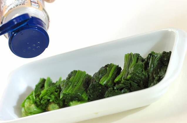 ホウレン草は熱湯でサッとゆでて水に取る。粗熱が取れたら水気を絞り、長さ4cmに切って塩コショウをする。