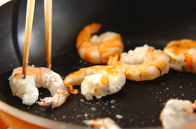 エビに片栗粉をからめる。フライパンにサラダ油大さじ1を強火で熱し、エビの色が赤く変わるまで炒めていったん取り出す。