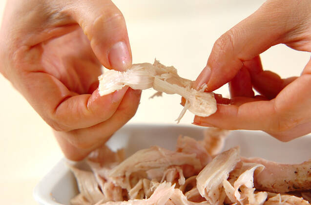 鶏ささ身は筋を引き、耐熱皿にのせて酒を振り、塩コショウをしてふんわりラップをかける。電子レンジで2分加熱し、そのままおいて蒸らす。粗熱が取れたら食べやすい大きさに裂く。電子レンジは600Wを使用しています。