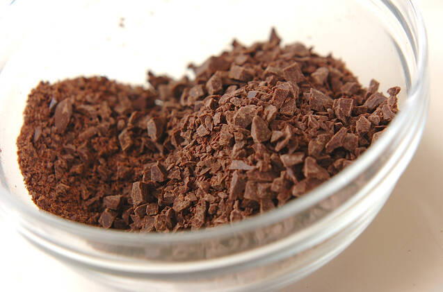 <ガナッシュ>を作る。細かく刻んだチョコレートをボウルに入れる。