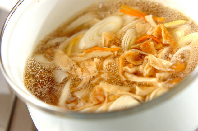 鍋に<スープ>の材料を入れて強火にかけ、煮たったらナメコ、白ネギ、切干し大根を入れ、弱火で3~4分煮る。