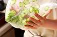 キュウリは両端を少し切り落とし、ピーラーなどで縦縞に皮をむき薄い輪切りにして、ビニール袋に入れ塩を加える。ビニール袋に空気を入れ、口を絞ってしっかり持ち、袋を振って塩をからめる。塩がからまれば出来るだけ袋の中の空気を抜き、口をしっかり縛り、水気が出るまで置いておく。