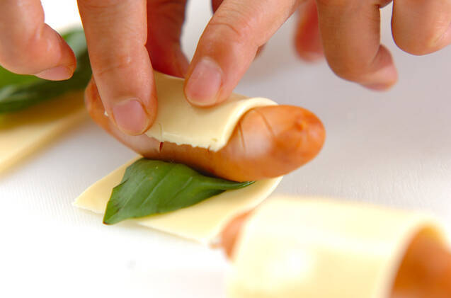 ソーセージに切り込みを入れる。スライスチーズは半分に切ってバジル、ソーセージをのせ、くるっと包む。さらに(2)のカボチャで包み込む(分量外のサラダ油を手につけると扱いやすいです)。<衣>の小麦粉を薄くからめ、卵を溶いてくぐらせ、パン粉をつける。