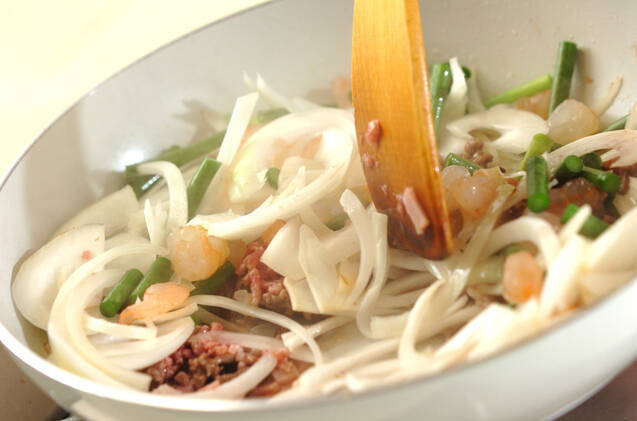 フライパンにサラダ油大さじ2を入れて強火にかけ、牛ひき肉、ベーコン、むきエビ、玉ネギ、ニンニクの芽を炒める。