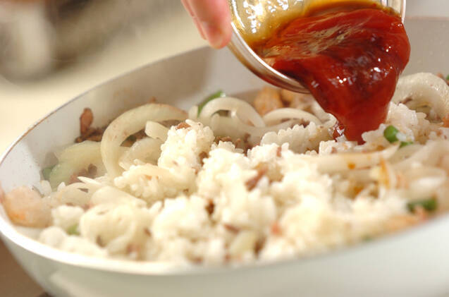 玉ネギが少し透明になってきたら、ご飯を加えて炒め合わせる。全体に混ざれば<調味料>の材料を加えてさらに炒め、塩コショウで味を調え、器に盛り分ける。刻んだ細ネギを散らす。