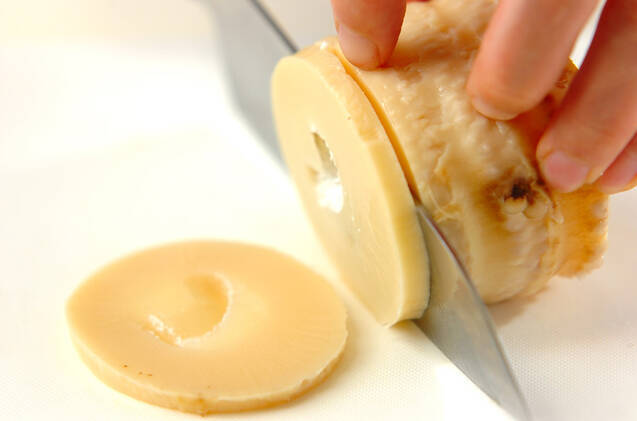 水煮タケノコは幅5mmの輪切りにする。