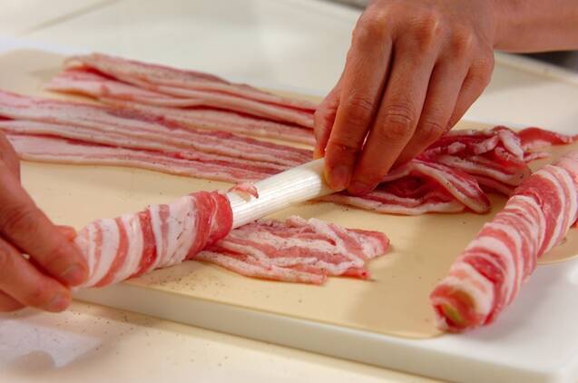 豚バラ肉に塩コショウを振る。白ネギは長さを半分に切り、豚バラ肉を巻き付ける。フライパンにサラダ油を熱し、豚バラ肉の巻き終わりを下にして入れ、中火で焼く。
