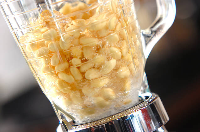 1の柔らかくもどした大豆をザルに上げて水切りし、重さを計って大豆の2倍の重さ-200mlの水を加える。ミキサーに入れて1~2分撹拌し、粗くつぶす。
