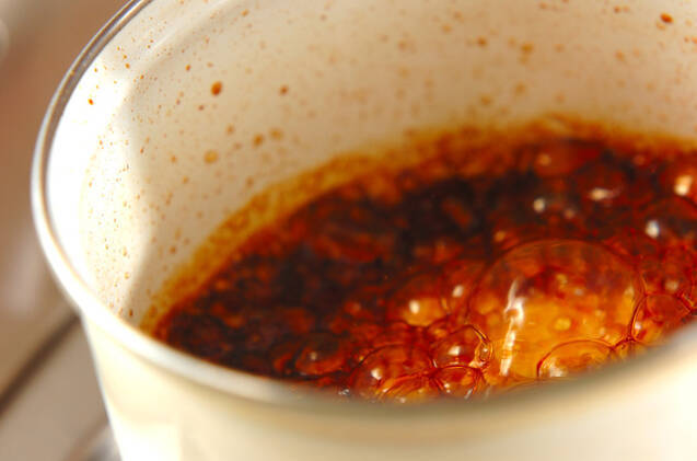<カラメルソース>を作る。鍋にグラニュー糖、水を入れ、鍋を揺らしてグラニュー糖をしっとりさせる。中火にかけ、茶色に色づいたところで熱湯を加える。