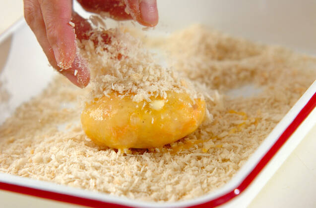 小判状にまとめ、<衣>の小麦粉、溶き卵、パン粉を順につける。