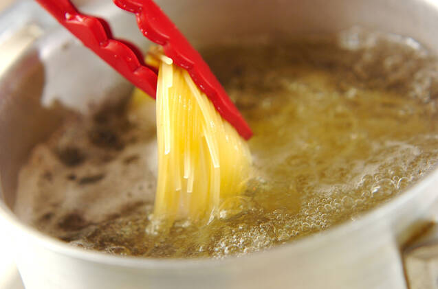 菜の花は根元を少し切り落とし、長さ4cmくらいに切って水に放ち、シャキッとさせる。鍋にたっぷりの湯を沸かして塩を加え、スパゲティーを袋の時間より1分短めにゆでる。