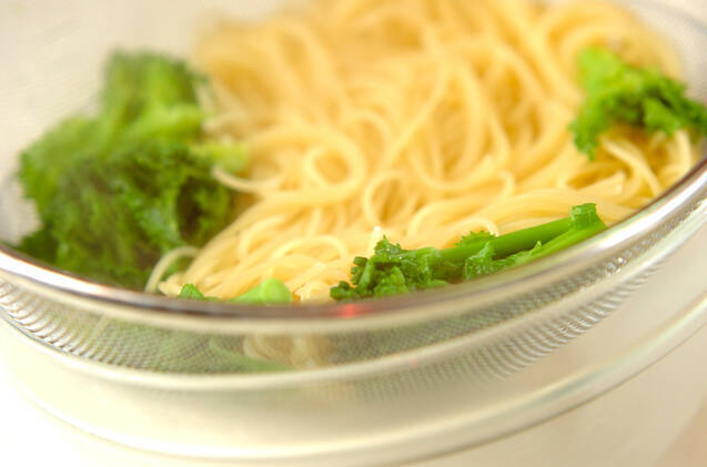 菜の花の水気をきって(1)がゆで上がる30~40秒くらい前に一緒に入れてゆでる。ゆで上がったらザルに上げ、ゆで汁をきる。