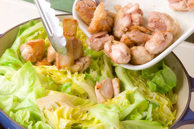 残りのバターを加えて春キャベツを並べ入れ、薄い焼き色をつける。1を戻して白ワインを加え、蓋をして5分、キャベツをひっくり返して後5分蒸し焼きにする。