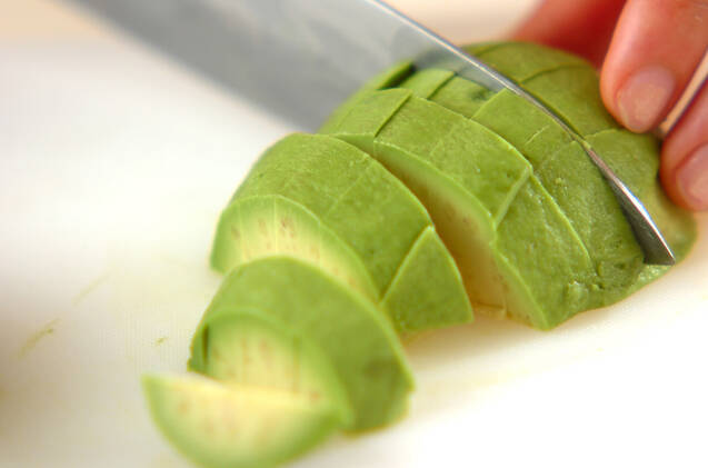 アボカドは種まで深く包丁を縦に入れ、両手でひねるように半分に分け、種を取って果肉を取り出し、1cm角に切る。