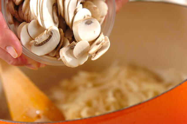 2の鍋に玉ネギを加えてしんなりするまで炒め、マッシュルームを加えてさらに炒める。