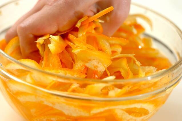 皮は薄く切ってすぐに水に放ち、数回水を変えながら濁りが出なくなるまでよく揉み洗いする。