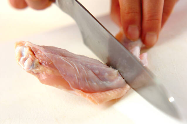鶏手羽先は関節で切り離し、骨の際に切り込みを入れる。