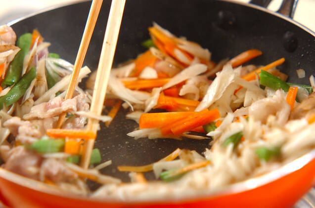 フライパンに分量外のゴマ油を強火で熱し、豚肉を炒める。色が変わったら水気をきったゴボウ、ニンジン、サヤインゲンを加えて炒め合わせる。
