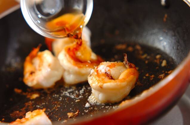 エビが丸まり、赤と白の色味がしっかり出てきたら砂糖、ナンプラーを振り、まんべんなくまぶす。