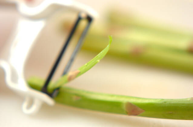 グリーンアスパラはピーラーで皮とハカマを削ぎ取り、茎の付け根の固い部分を切り落とし、食べやすい大きさに切る。