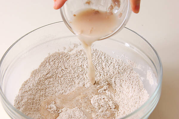 合わせたライ麦粉、強力粉をボウルに入れ、砂糖を加えて泡立て器で混ぜ合わせる。ぬるま湯で溶いたインスタントドライイーストを加え、塩、牛乳、レモン汁を加えて混ぜ合わせる。