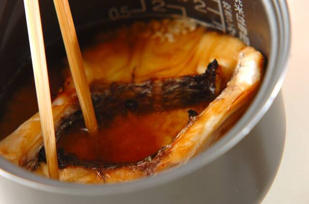 炊飯器にお米、<調味料>の材料を入れて分量線まで分量外の水を加え、鯛をのせて炊く。