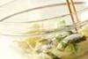 <ユズ酢>のユズ皮は内側の白い部分を削ぎ落として細切りにし、水に放ってアクを抜く。水に放っておくと、時間をおいても切り口が黒ずみにくくなります。