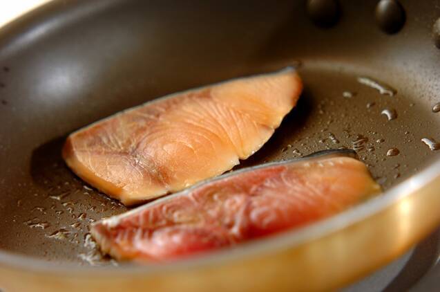 フライパンを弱めの中火に熱し、サラダ油をひく。水気を拭き取ったブリを並べ入れ、フチが白くなるまで焼く。