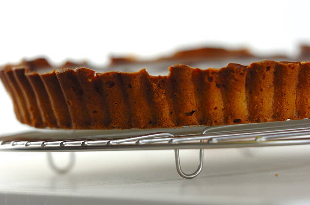 (2)の<タルト生地>を薄く伸ばして型に敷き、その上にオーブンペーパーを敷き、重石をのせて200℃に予熱しておいたオーブンで約5分焼き、重石を外してタルトの表面がキツネ色になるまで約15~20分焼く。焼けて粗熱が取れたら、型から外してケーキクーラーなどにのせて冷ましておく。