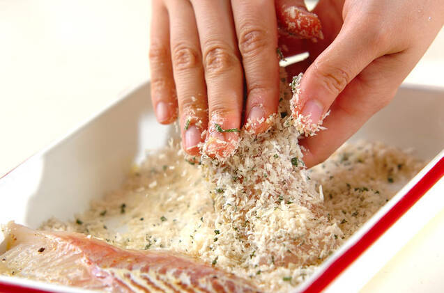 白身魚にオリーブ油をぬり、<ミントパン粉>をしっかりつける。
