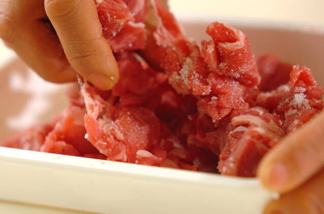 牛肉は長さ3cmに切り、塩コショウ、砂糖をもみ込む。