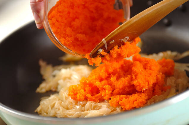 フライパンにサラダ油を入れ、強めの中火で玉ネギをよく炒める。少し茶色くなったらニンジンを加え、さらに炒めて鍋に移す。