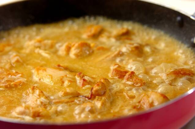 鶏もも肉を漬けていたボウルに分量の水と塩を入れ、残った<調味料>と混ぜ合わせる。(3)に加え、強火で沸騰するまで煮る。