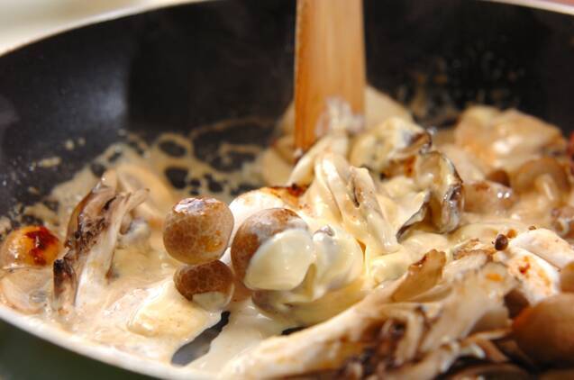 (1)のフライパンにバターを熱し、キノコ類を加えて炒める。全体に炒めたら、顆粒スープの素を加えて少し炒める。マヨネーズ、生クリームを加えてサッと煮て、塩コショウで味を調える。