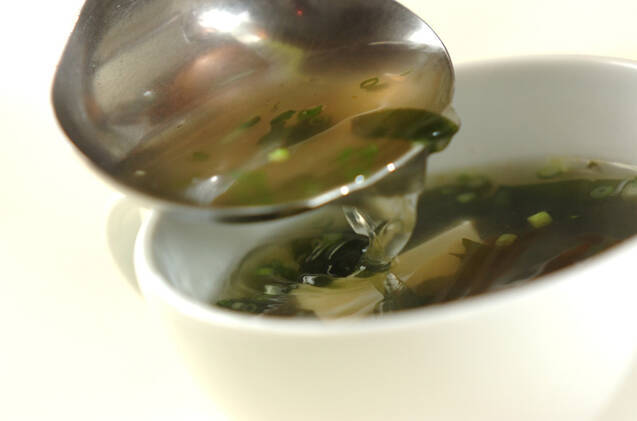 再び煮たったら、コショウで味を調え、ワカメ、刻みネギを加えて火を止め、ひと混ぜして器に注ぐ。