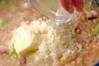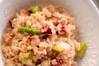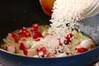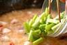 残りの<スープ>、グリーンアスパラを加え、全体に混ぜ合わせながら煮詰める。お米を少し食べてみて、お好みの固さになったら火を止める。