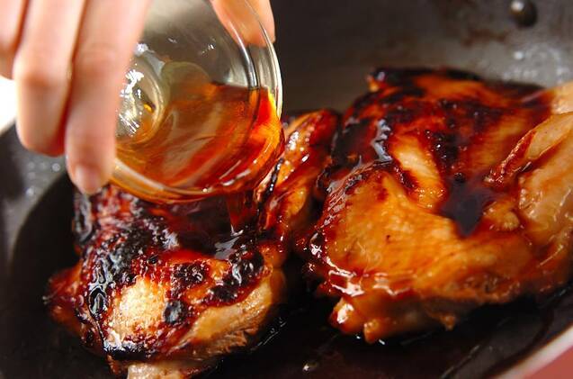 余分な脂を捨てて<調味料>の材料を加え、からめながら焼いて食べやすい大きさに切る。