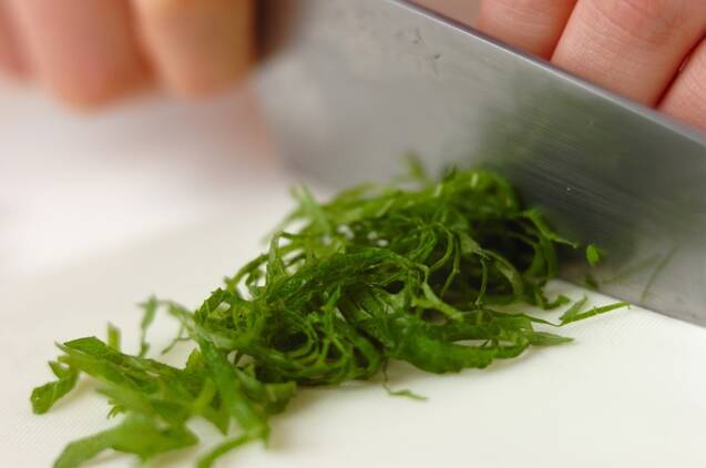 お米は炊く30分以上前に水洗いし、ザルに上げておく。大葉は軸を切り落とし、せん切りにする。