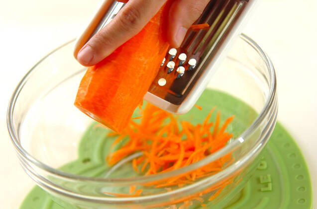 ニンジンは皮をむき、せん切り用スライサーでせん切りにする。