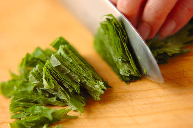 大葉は縦半分に切り、さらに横に太めのせん切りにして水に放ち、水気を絞る。甘塩鮭は皮と骨を取って、食べやすい大きさの削ぎ切りにする。大きめのフライパンにオリーブ油大さじ1と幅1cmに切ったベーコン、甘塩鮭を加えて弱めの中火で炒める。