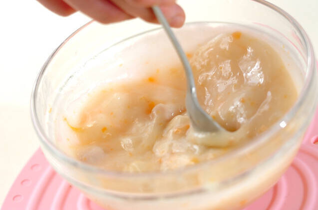 ホワイトシチューにコーンスターチを加え、ラップをして電子レンジで2分加熱する。いったん取り出して混ぜ、ラップをせずに1分加熱する(メーカーにより、トロミが足りない場合はさらに1分ほど加熱をする)。電子レンジは600Wを使用しています。