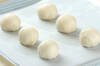 強力粉をボウルに入れ、インスタントドライイースト、砂糖を真ん中に置く。無塩バター、塩をはしにおき、温めた水をかけ、カードでひとまとまりになるまで混ぜる。