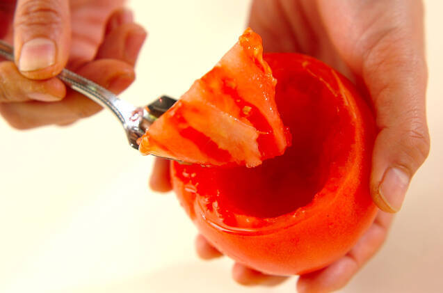 トマトはヘタ側を少し切り落とし、中をくり抜いてカップ状にする。切り落としたヘタ側も使いますので取り置いて下さい。